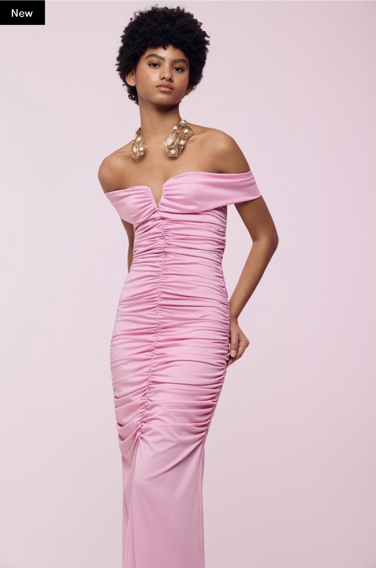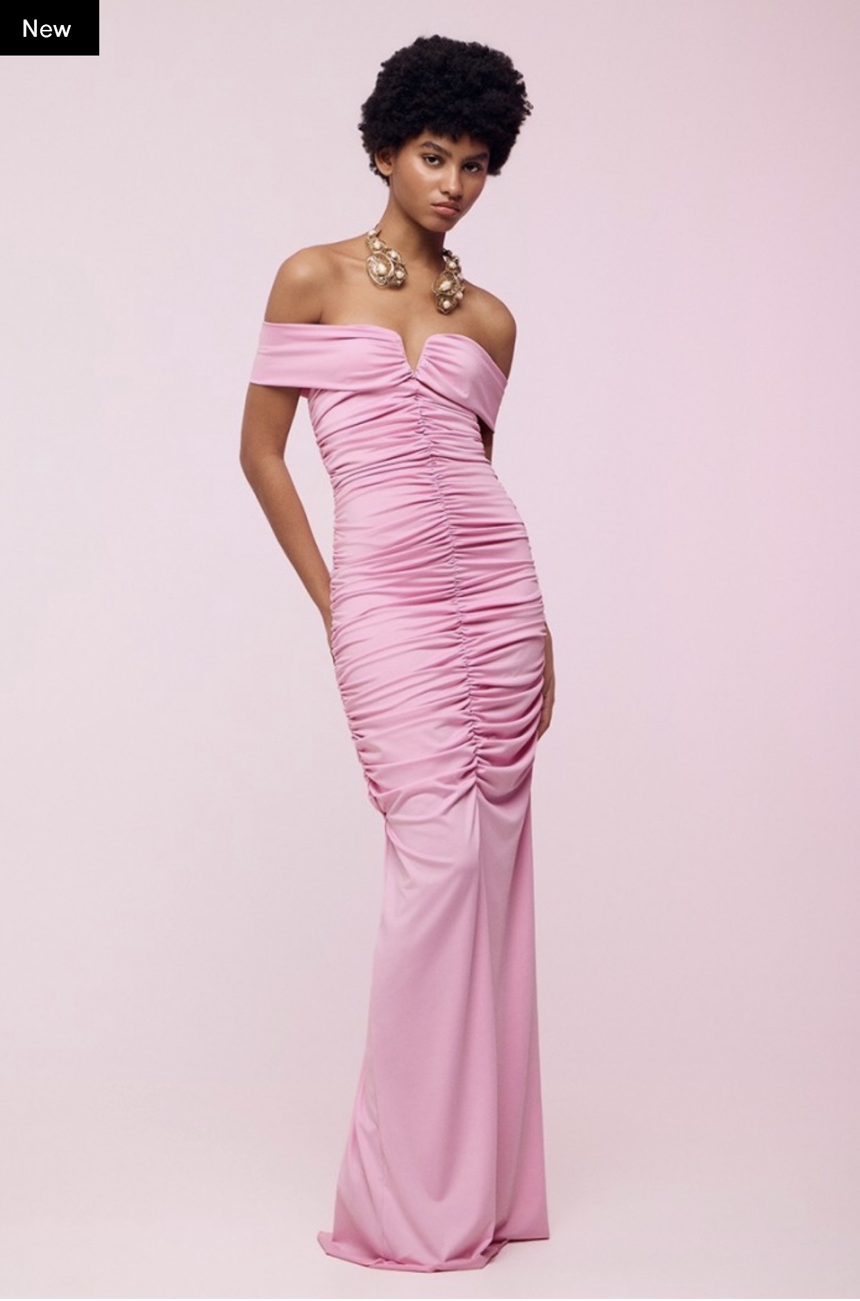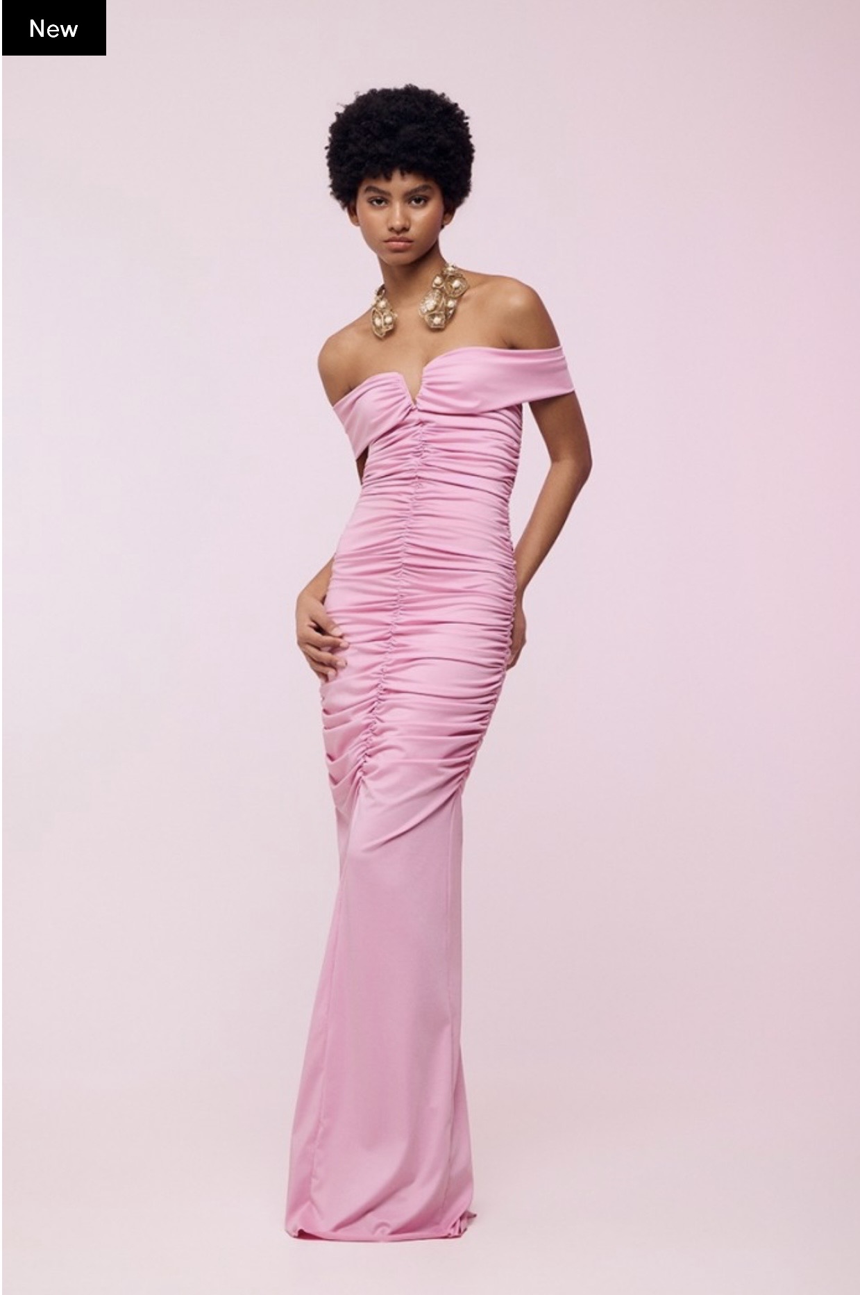 Μακρύ έξωμο στενό φόρεμα, με άνοιγμα στο πίσω μέρος, διαθέτει σούρες και κρυφό φερμουάρ.