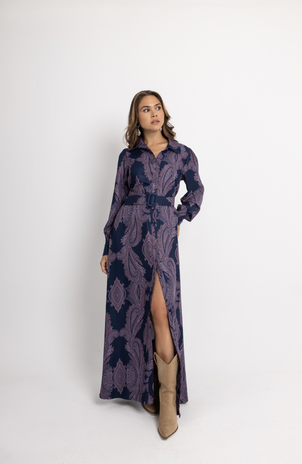 Φόρεμα μακρύ σεμιζιέ σε απόχρωση μπλε με λαχούρια μωβ. Αποτελείται από κουμπιά και φαρδιά ζώνη στην μέση.