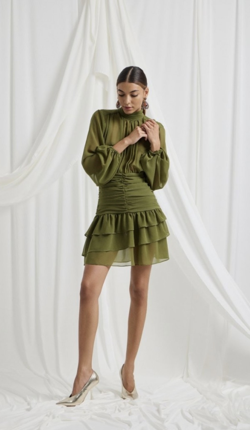 Λαδί φόρεμα μίνι με μοναστηριακό γιακά και βολάν.