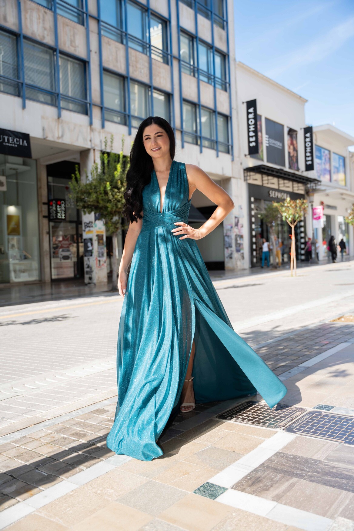 Μάξι αέρινο φόρεμα σε πετρόλ απόχρωση με γκλιτερ και πολυμορφική πλάτη. Διαθέτει σκίσιμο στην αριστερή πλευρά.