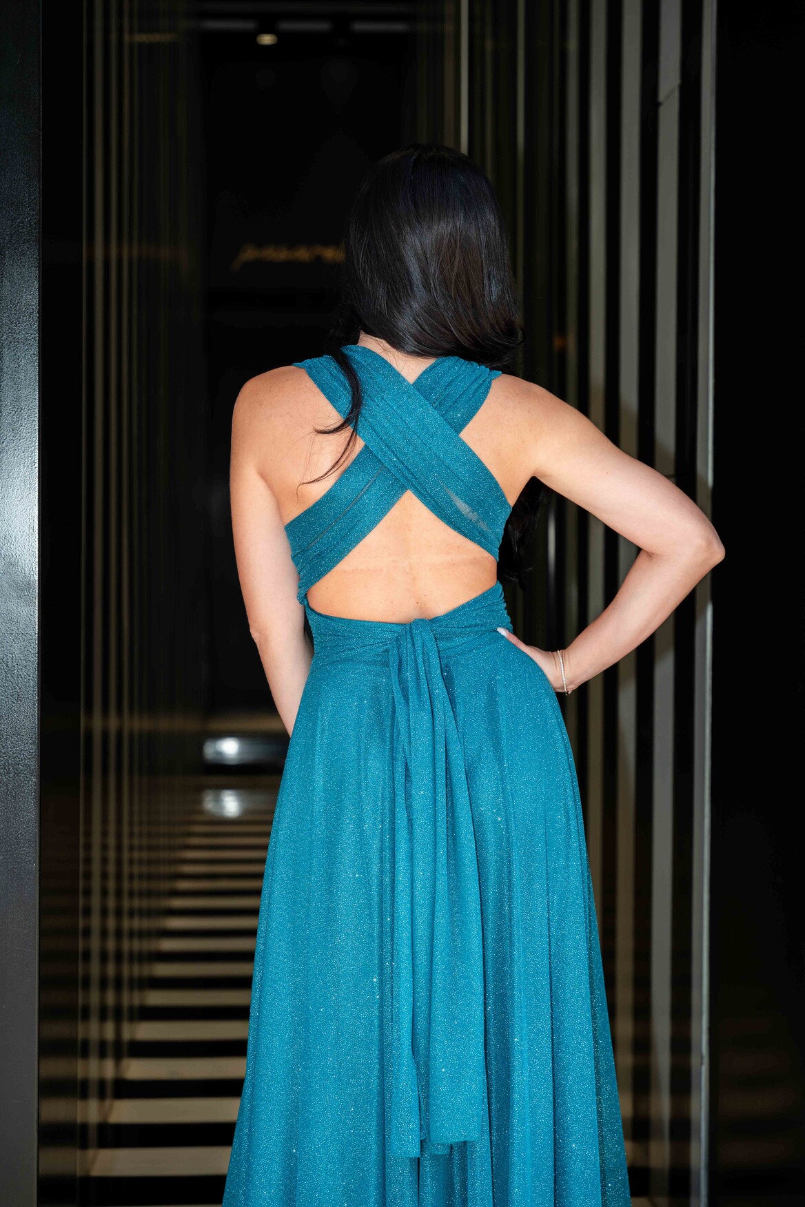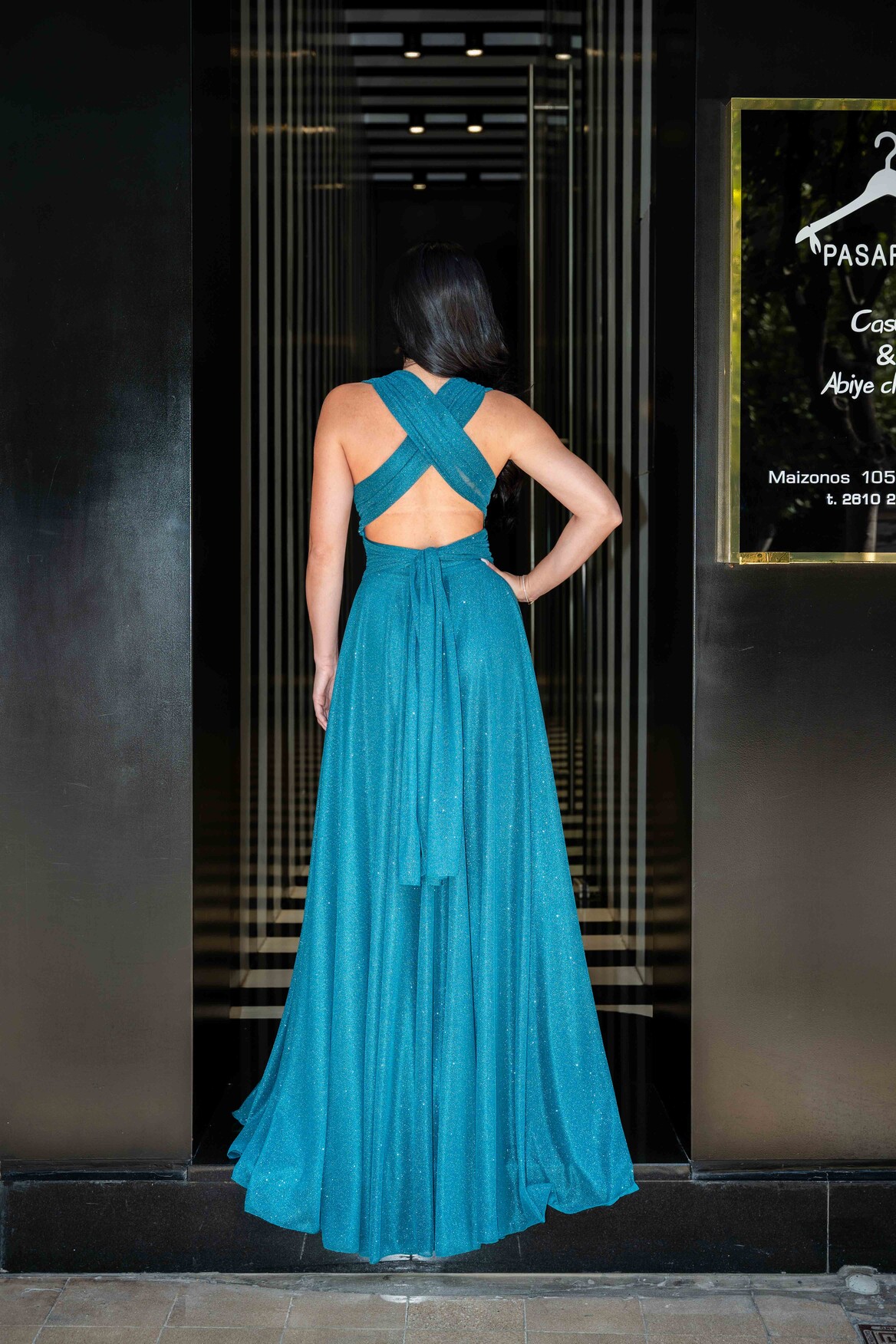 Μάξι αέρινο φόρεμα σε πετρόλ απόχρωση με γκλιτερ και πολυμορφική πλάτη.