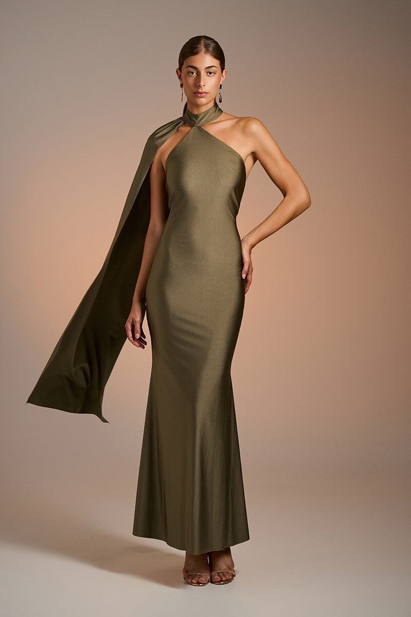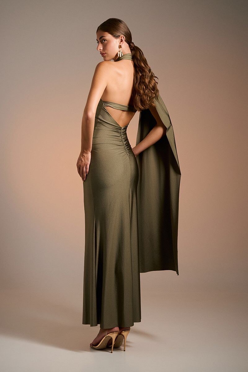 Μάξι φόρεμα ελαστικό με ανοιχτή πλάτη και λωρίδα στο σημείο του σουτιέν για έξτρα στήριξη. Διαθέτει ντραπάρισμα και σούρες στο πίσω μέρος και εντυπωσιακό ενσωματωμένο μαντίλι στον λαιμό