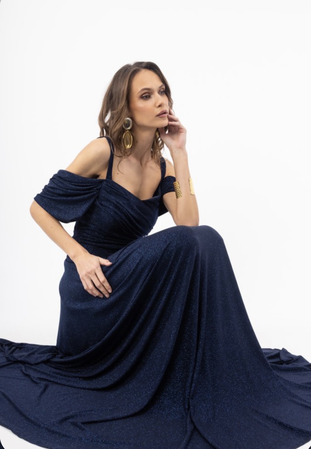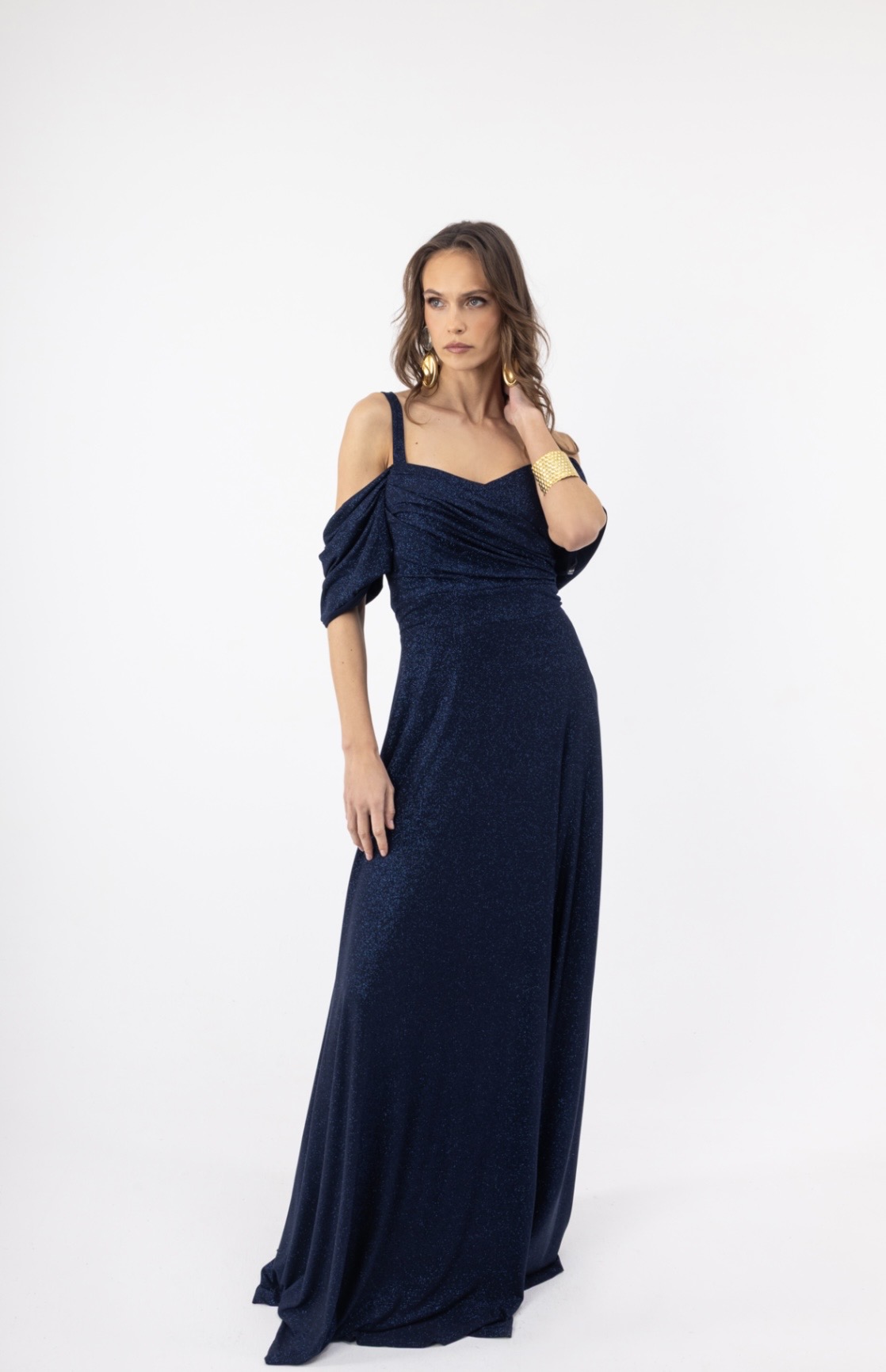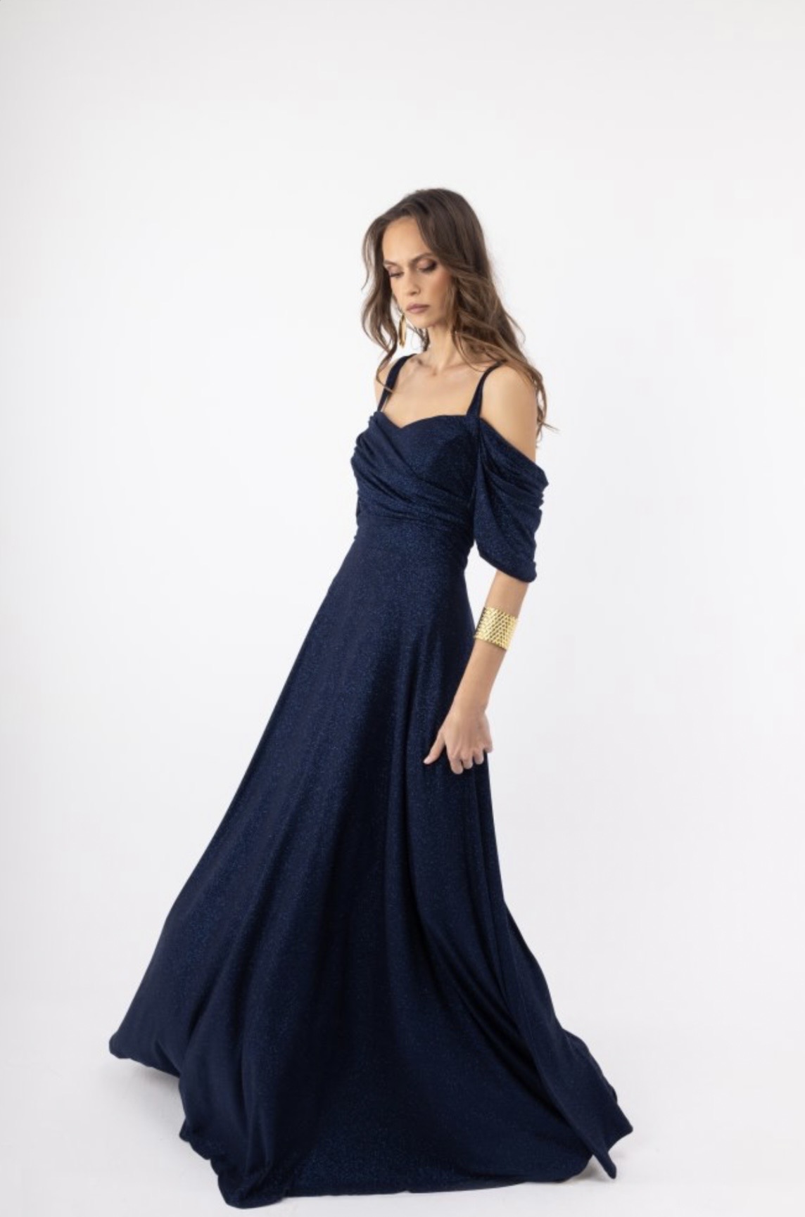 Γυναικείο Maxi Φόρεμα Navy και Τερακότα με Glitter, Λεπτές Τιράντες & Off Shoulder Σχέδιο