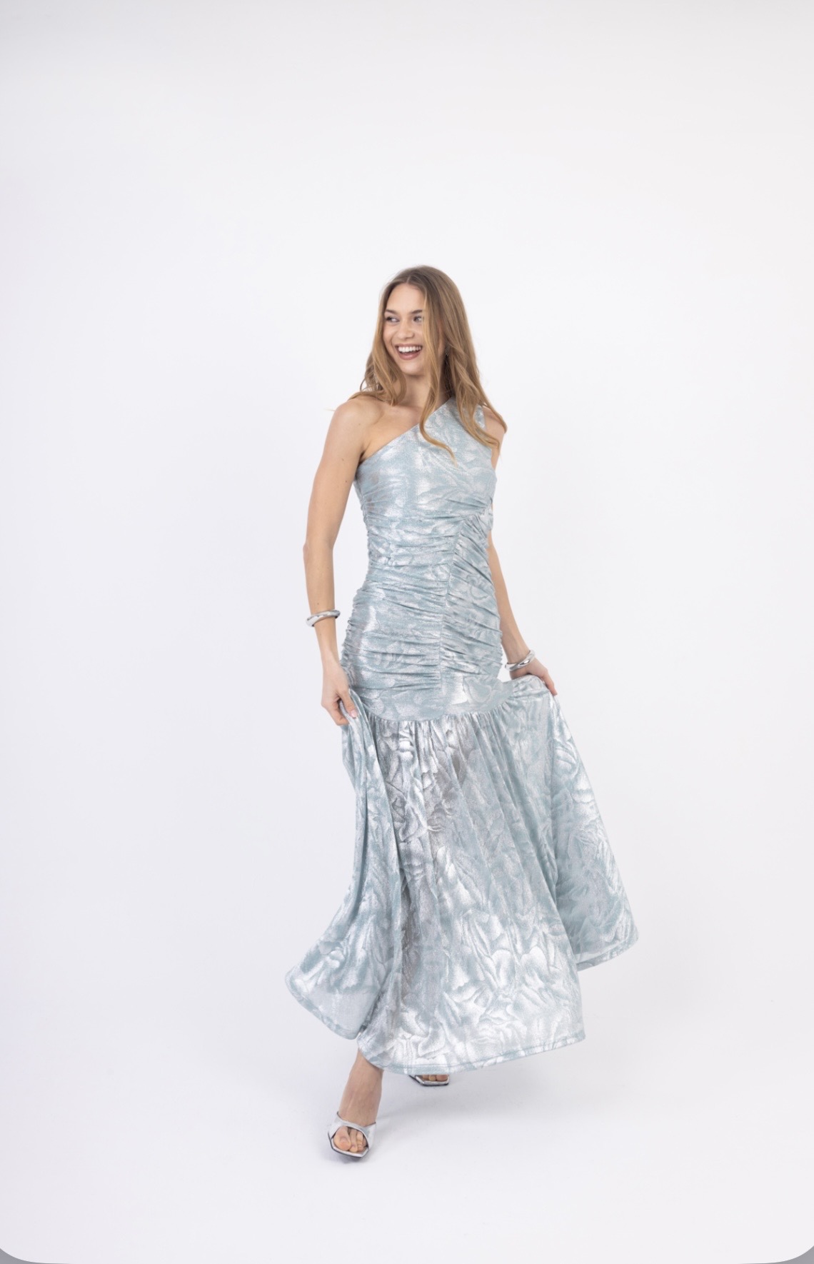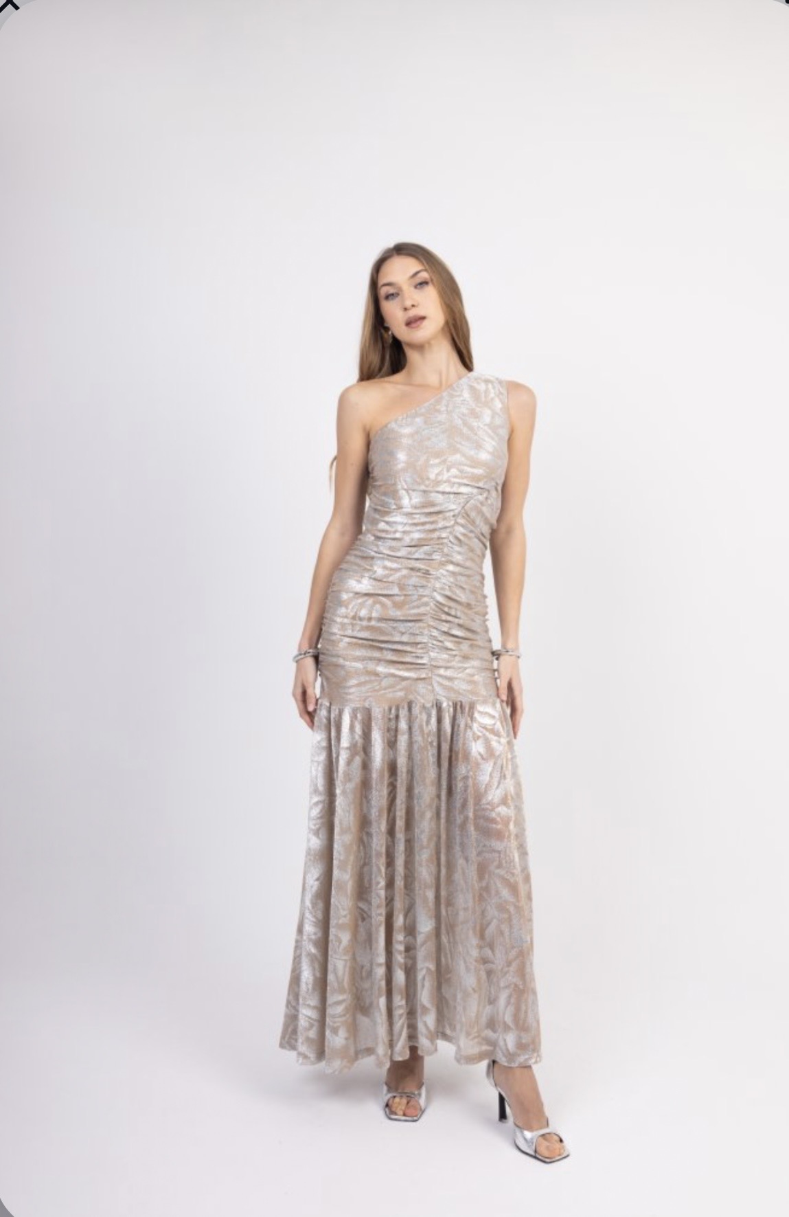 Maxi Φόρεμα One Shoulder σε Μπεζ Metallic και Γαλάζια Metallic απόχρωση. Διαθέτει σούρες που κολακεύουν το σώμα και αέρινο τελείωμα