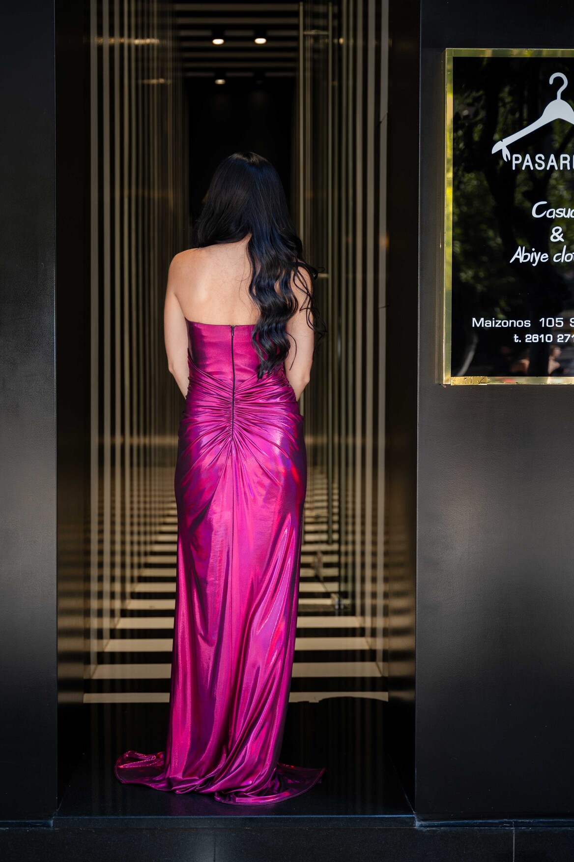 Μάξι γοργονέ φόρεμα στράπλες σε μεταλλικό ύφασμα απόχρωση magenta. Αποτελείται από ιδιαίτερο μπούστο κορσέ και λεπτομέρεια κόμπου στην κοιλιά , διαθέτει αριστερό σκίσιμο και ντραπάρισμα στο πίσω μέρος.