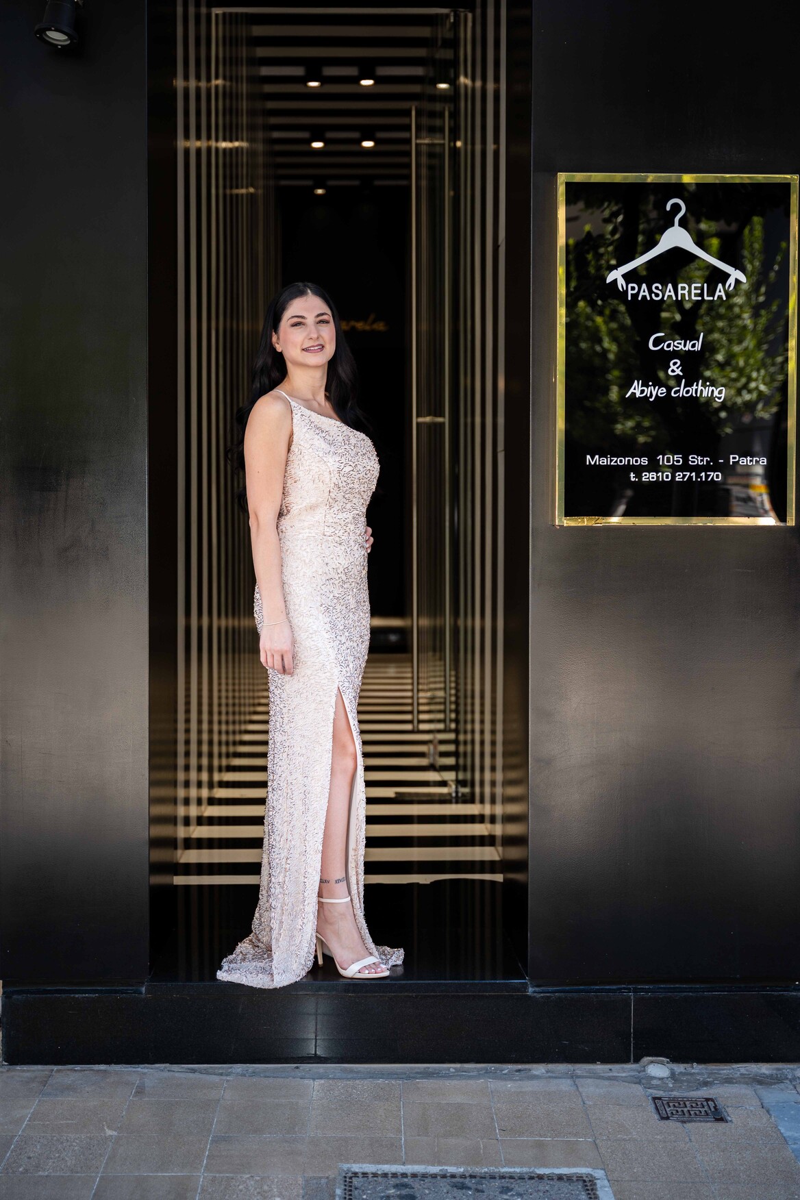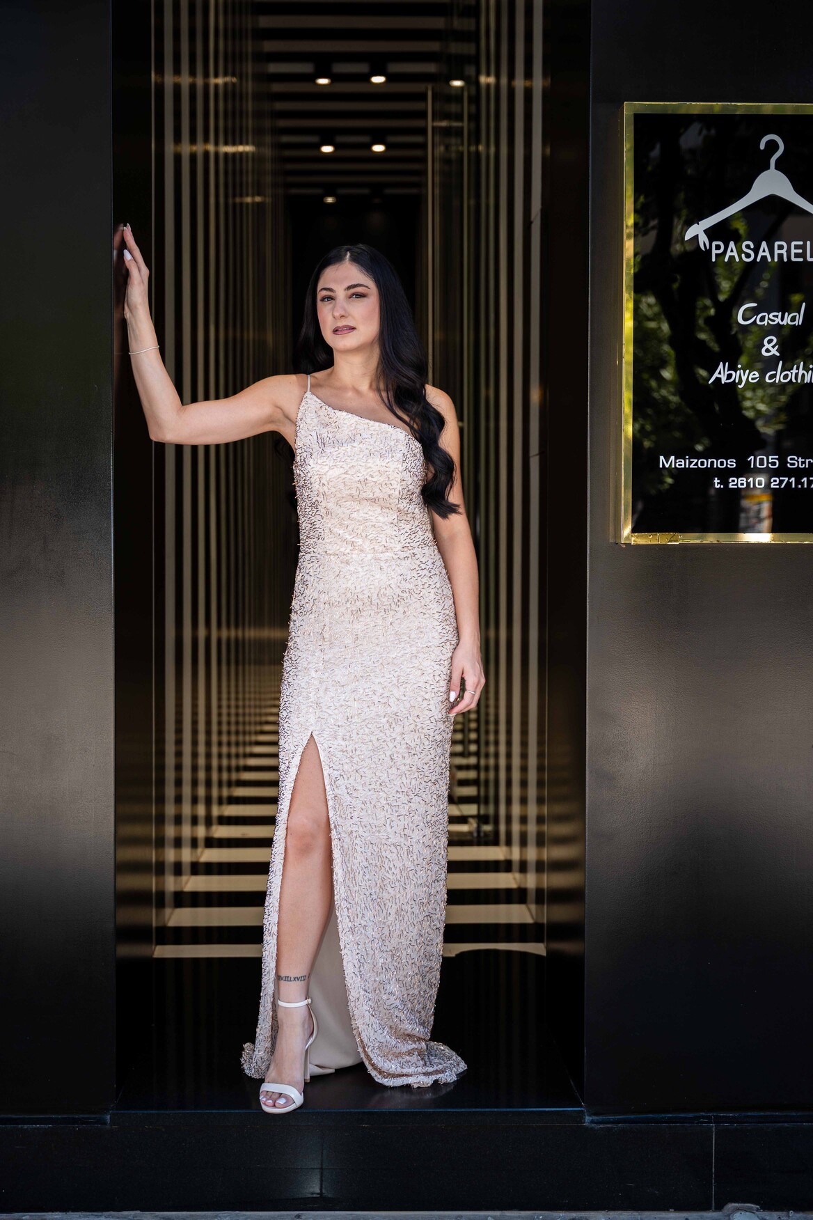 Μάξι γοργονέ φόρεμα με έναν ώμο σε μπεζ απόχρωση αποτελείται από ιδιαίτερο ύφασμα με χάντρες χρυσές.