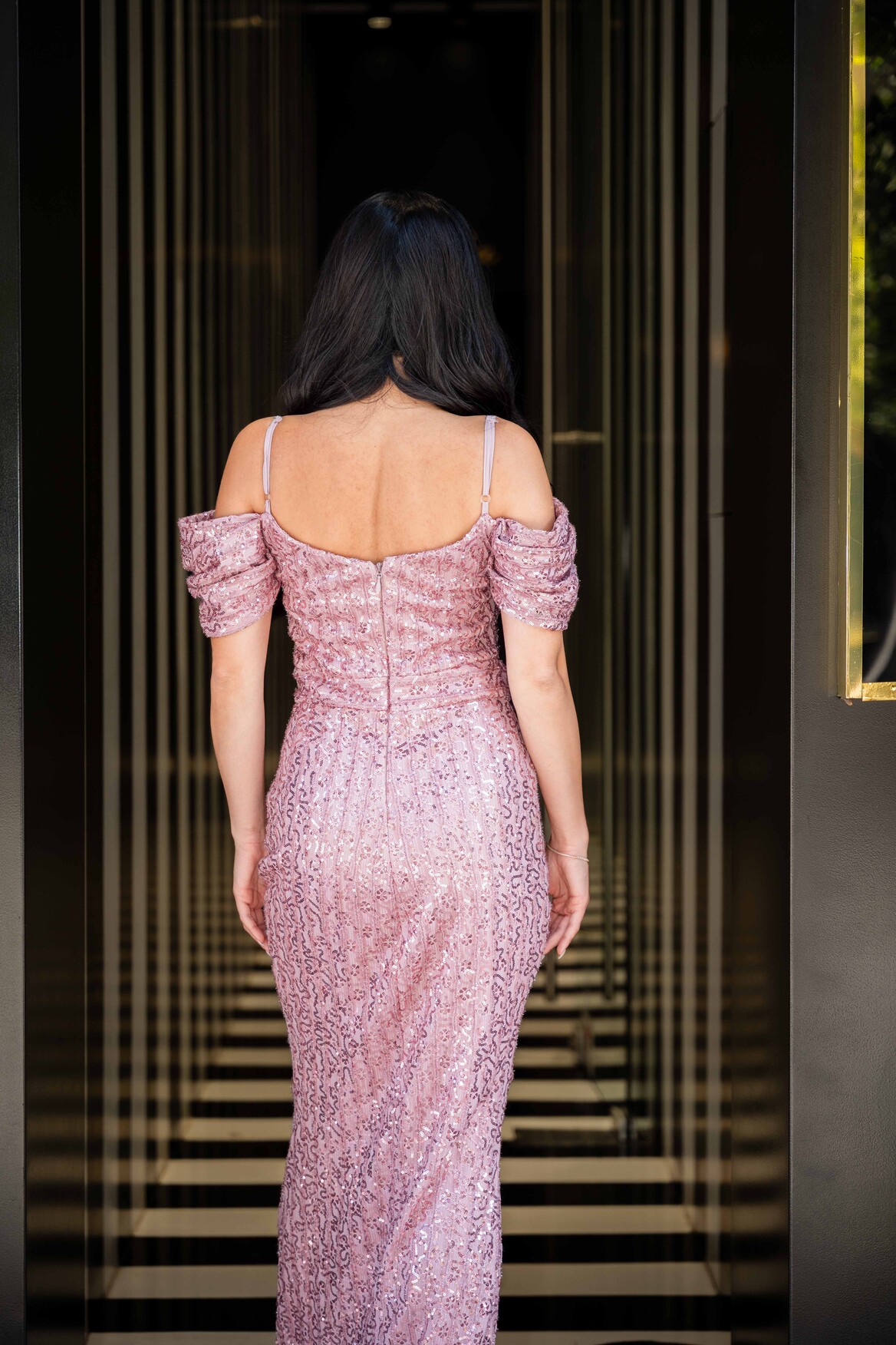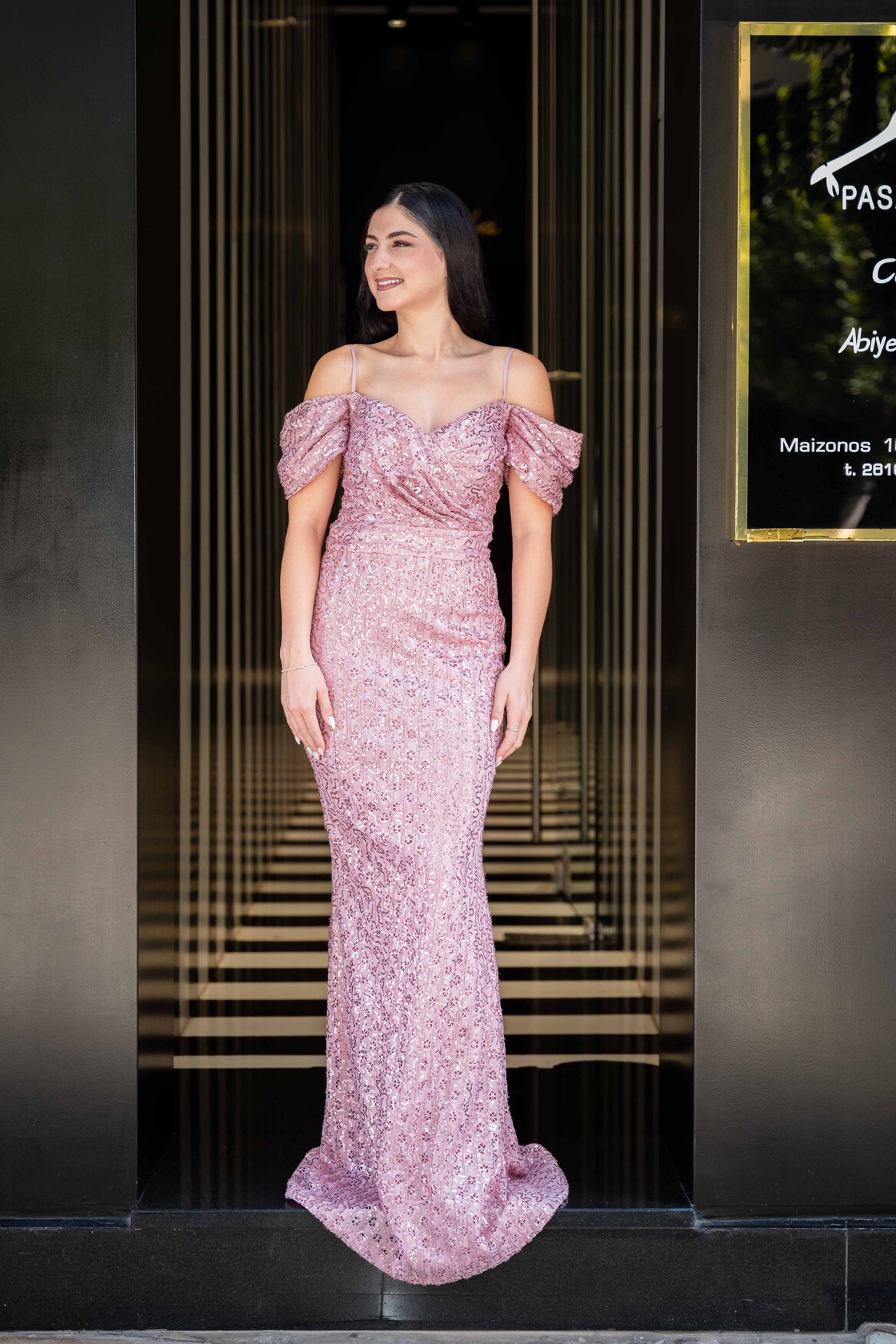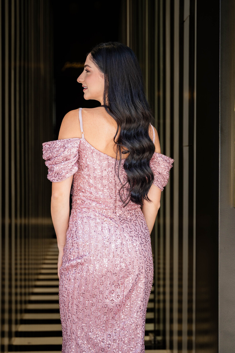 Μάξι γοργονέ φόρεμα σε απόχρωση σάπιο μήλο με ιδιαίτερο πλαϊνό μανικάκι και αυξομειώμενη τιράντα αποτελείται από μικρές λεπτομερείς με παγιέτα και πολύ ελαφρή γκλίτερ. Σταθερό ύφασμα.