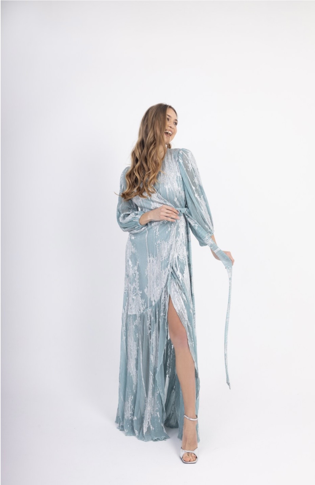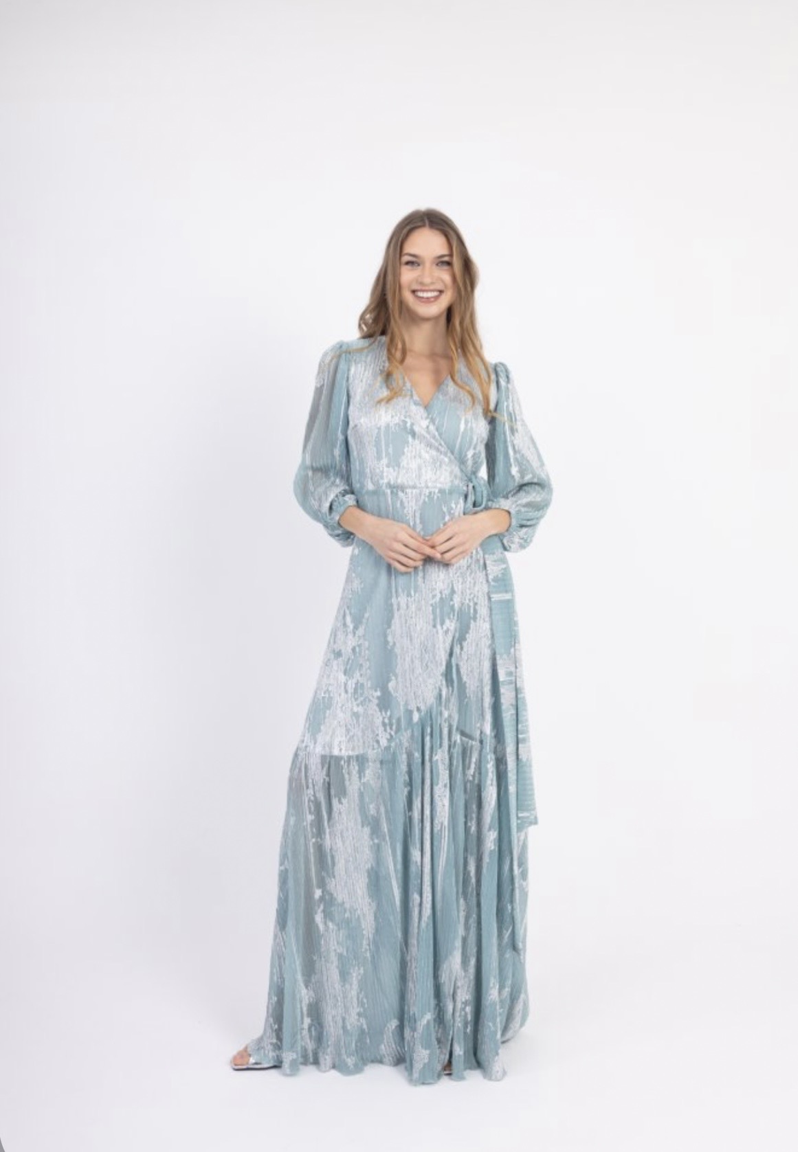 Μάξι λούρεξ κρουαζέ φόρεμα σε απόχρωση μέντα με διακριτικές ασημένιες λάμψεις. Διαθέτει μακρύ μανίκι με λαστιχάκι στο τελείωμα