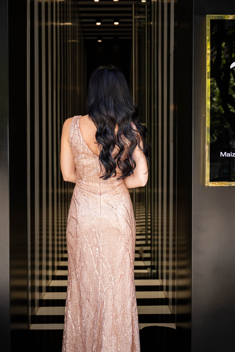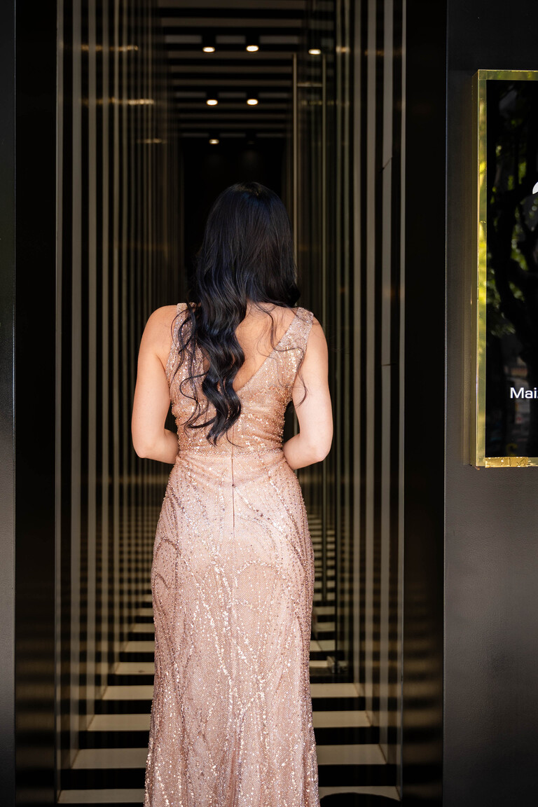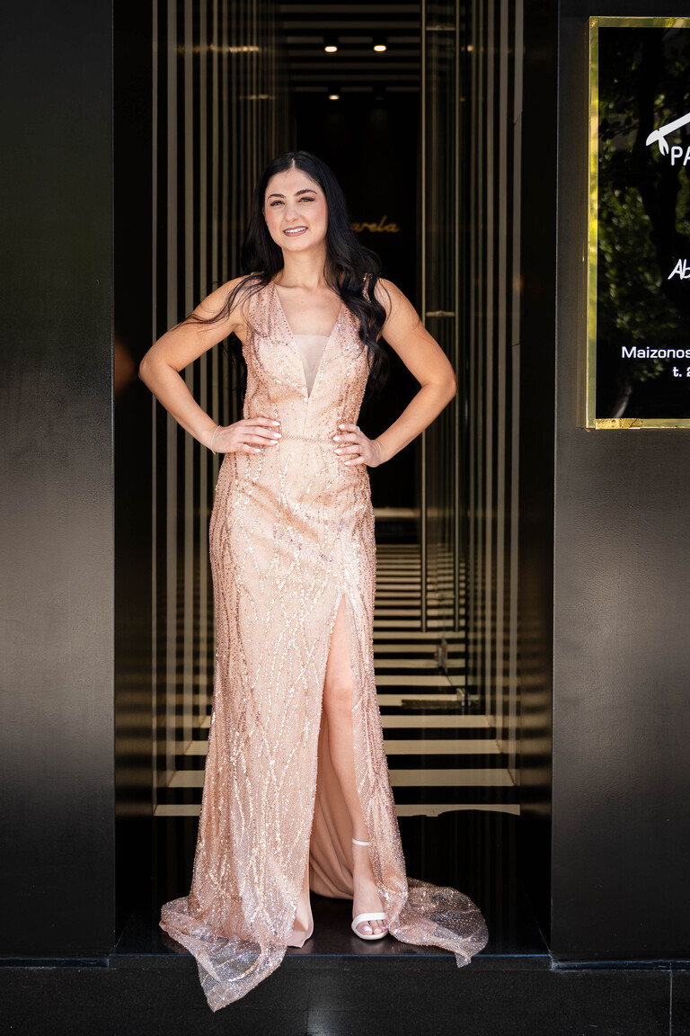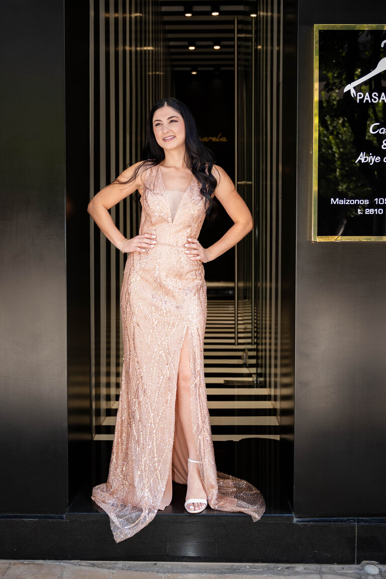 Μάξι χρυσό λαμπερό φόρεμα. Αποτελείται από χάντρες και στρας στην ύφανση του και διαθέτει αριστερό σκίσιμο.
