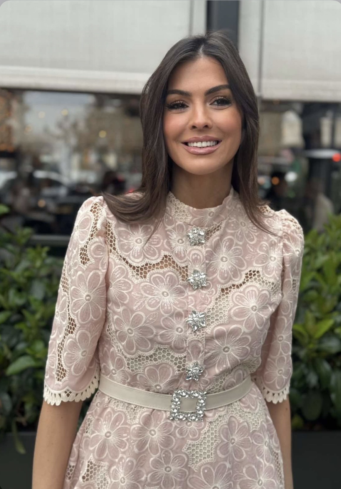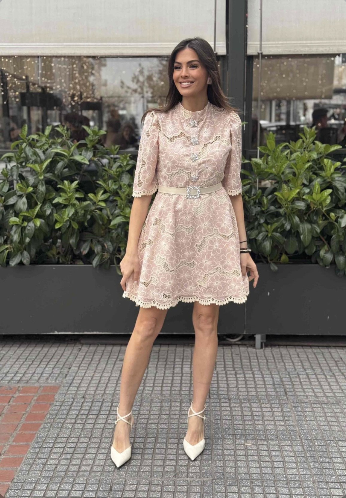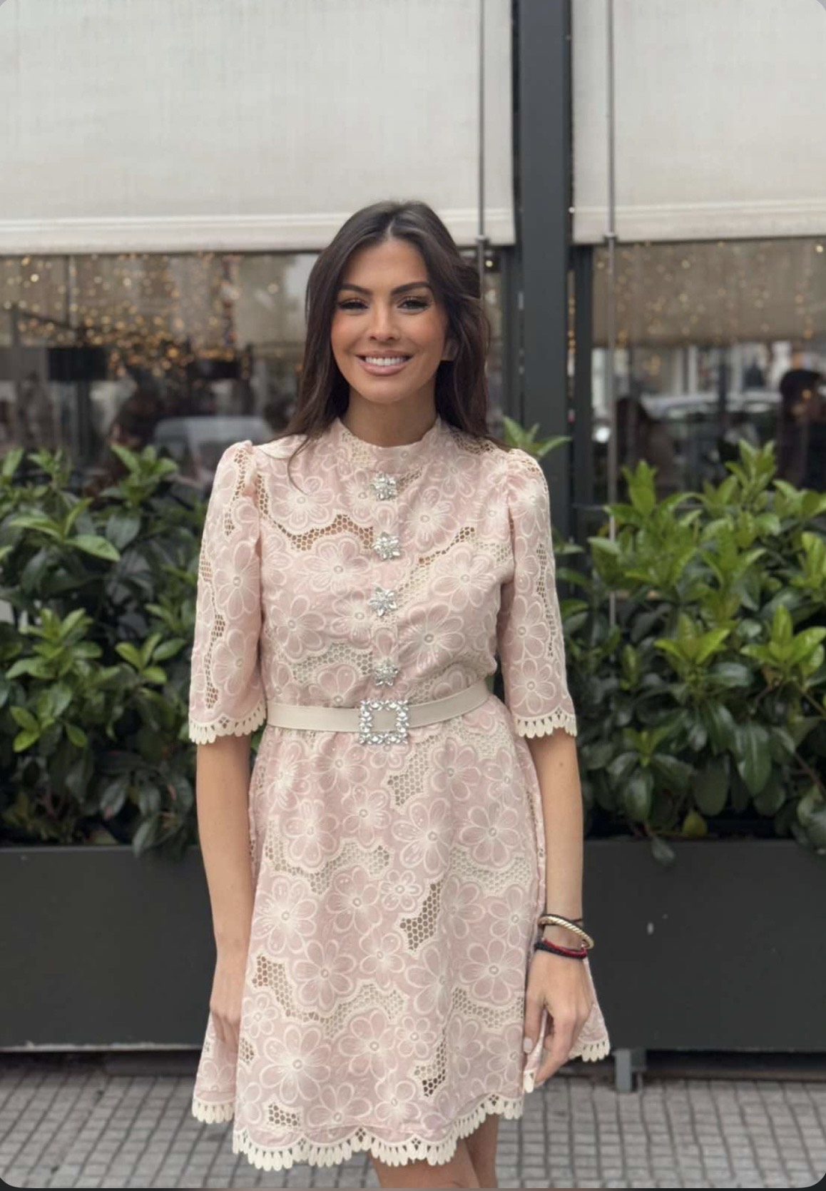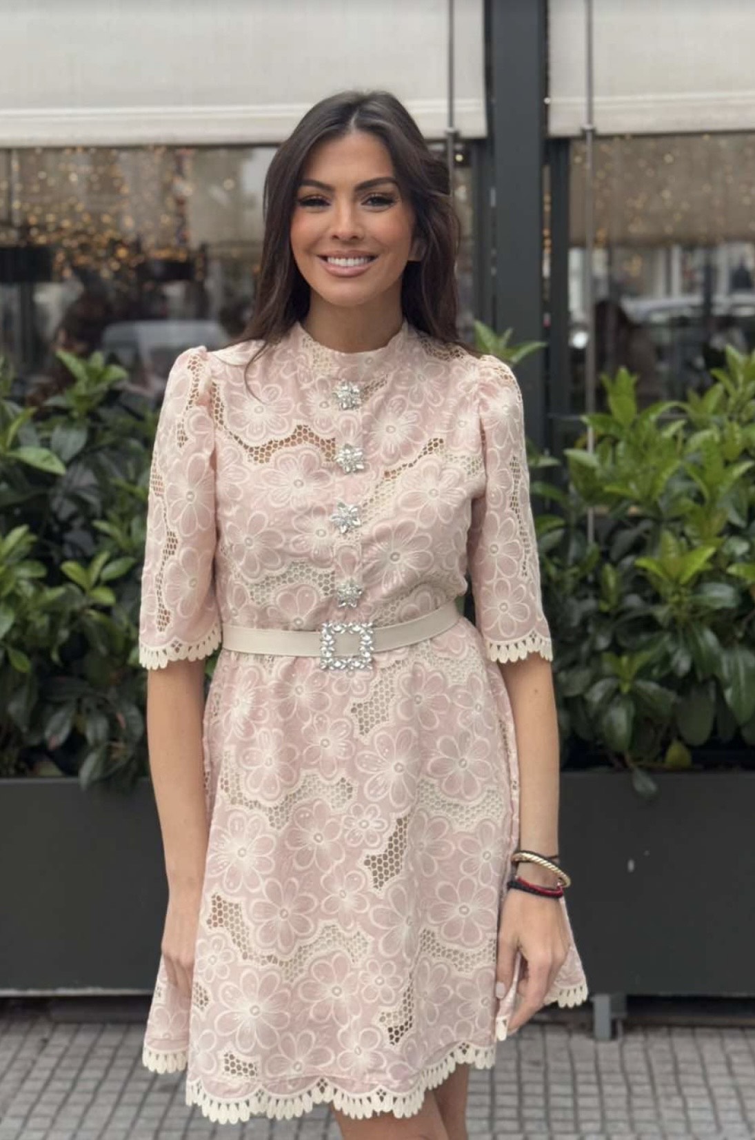 Μίνι φόρεμα από ροζ διάτριτη βαμβακερή δαντέλα και λεπτομέρεια στρας κουμπάκια.