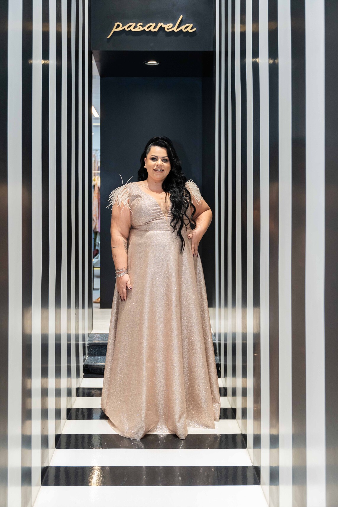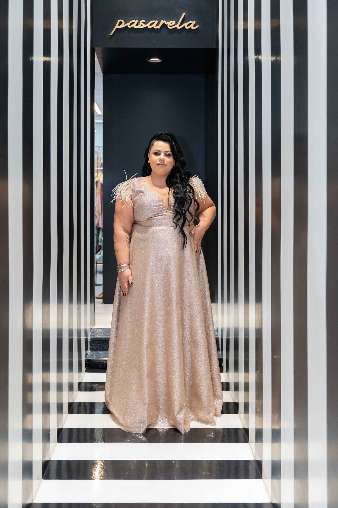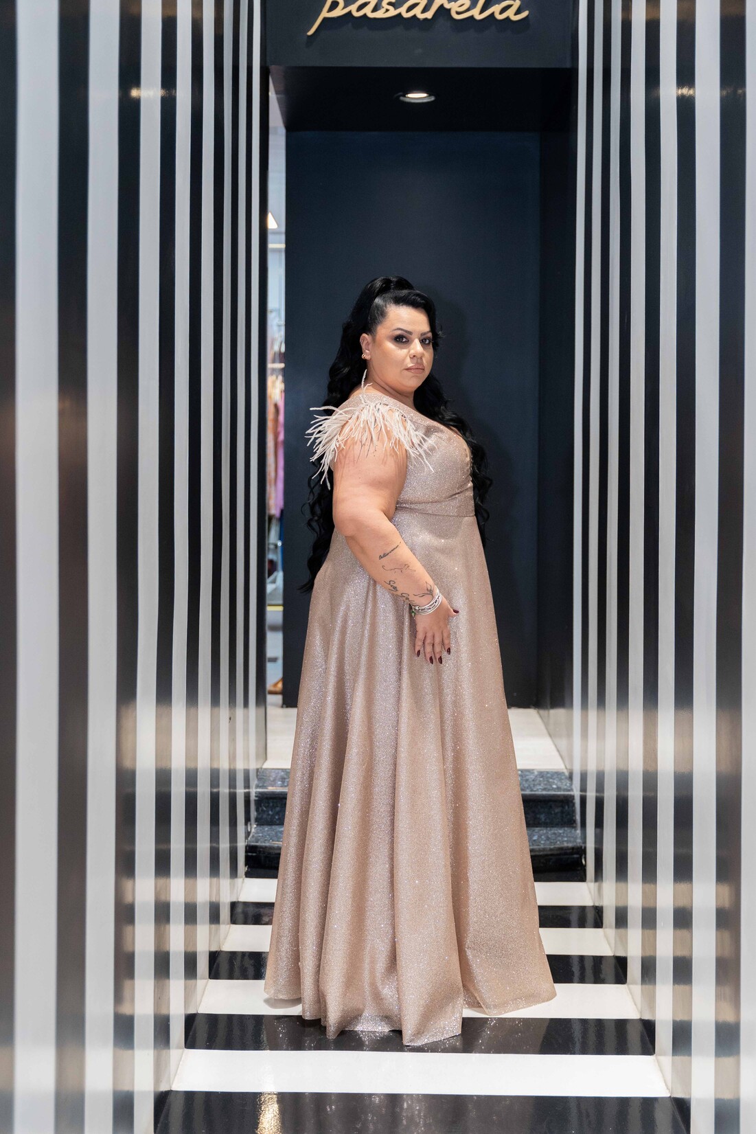 Plus size Μάξι αέρινο φόρεμα με γλίτερ σε χρυσή απόχρωση και χοντρή τιράντα για έξτρα στήριξη διαθέτει πούπουλο στον ώμο για εναλλακτικό μανίκι.